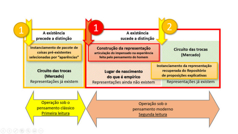 - a operação sob o pensamento clássico tem o ponto de início na visão do fenômeno ‘operações’ colocado sobre o cruzamento entre os objetos dado e recebido, ainda que nesse tipo de pensamento a noção de objeto seja distinta da que vige no pensamento moderno;
